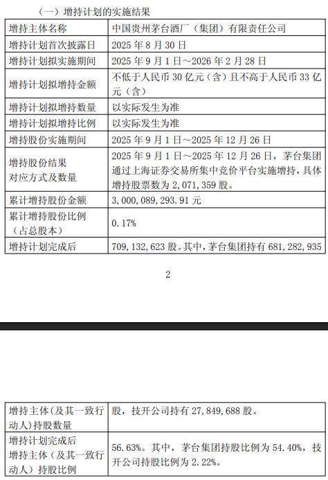12月29日晚间,贵州茅台(600519.SH)公告,根据公司控股股东中国贵州茅台酒厂(集团)有限责任公司相关通知,截至2025年12月26日,本次增持计划已实施完毕。茅台集团增持了207.14万股公司股票,占公司总股本的0.17%,增持金额约为30亿元。
